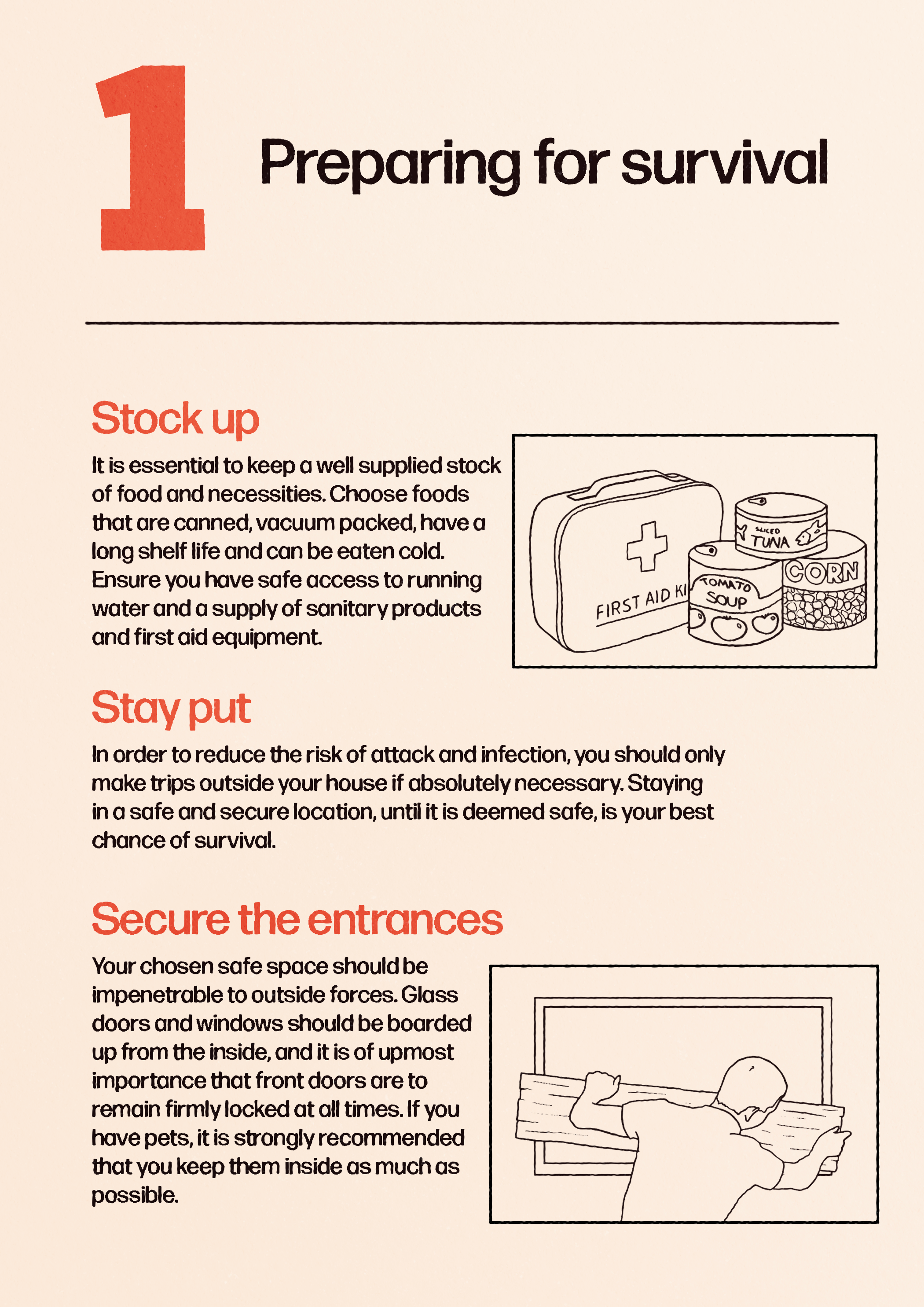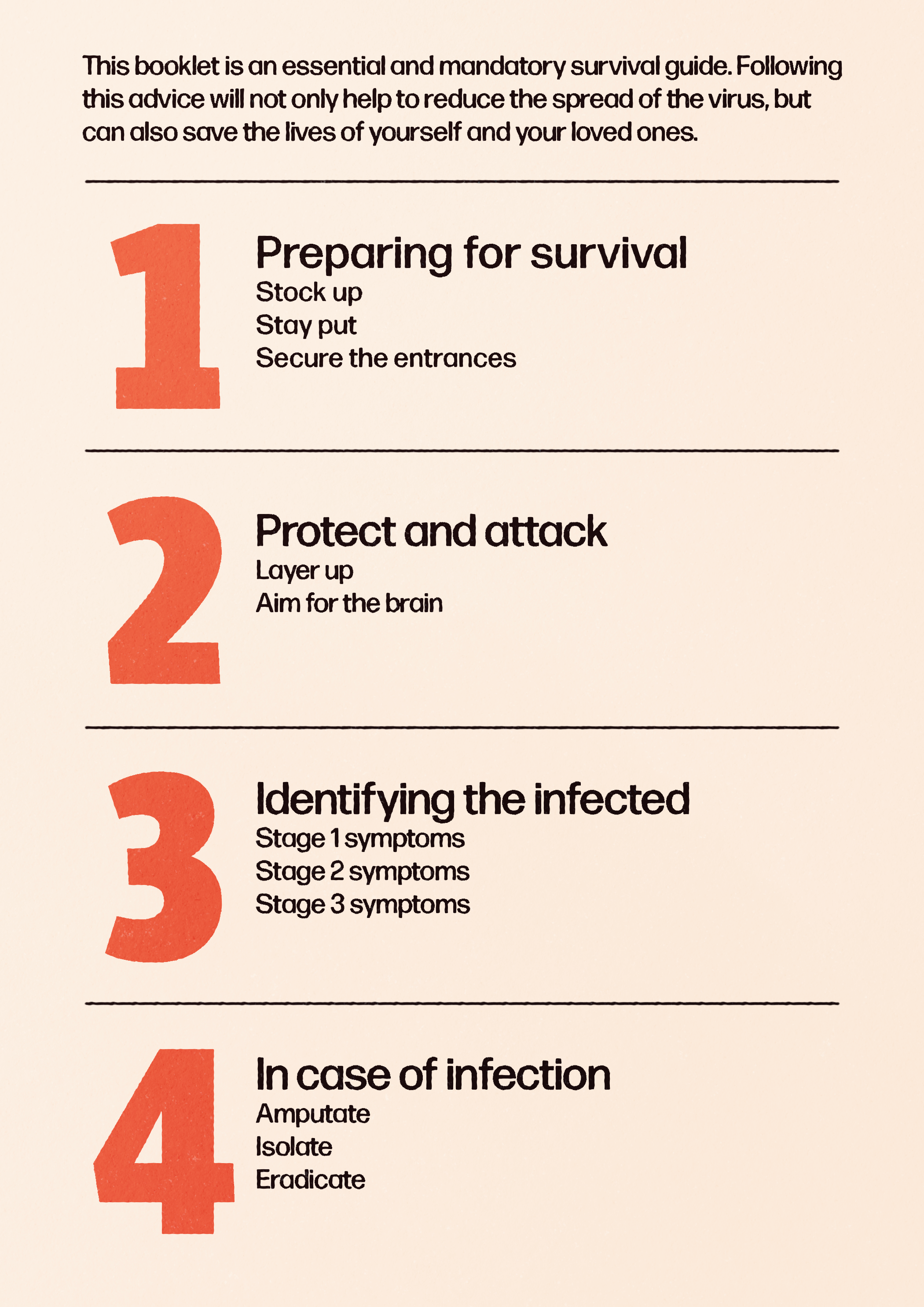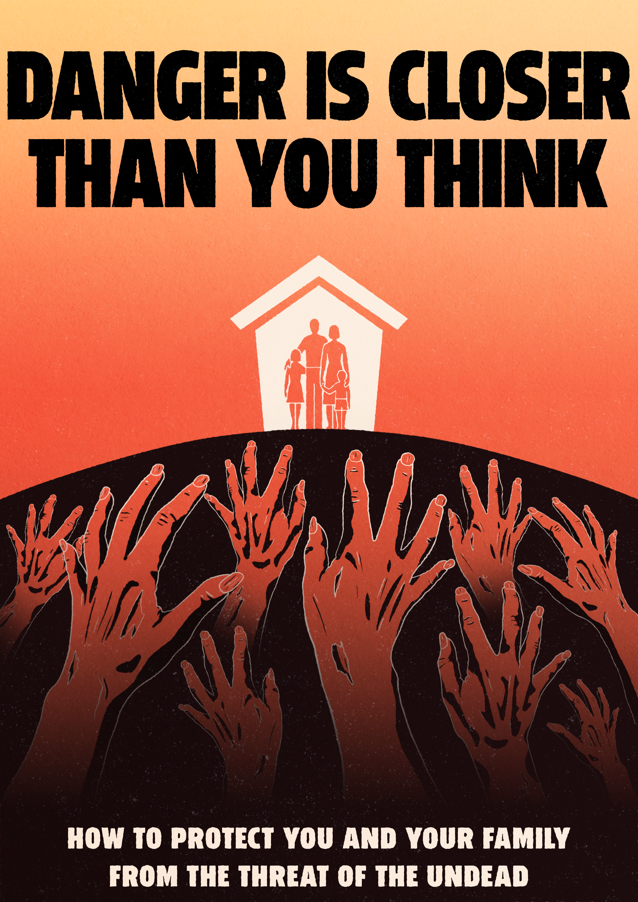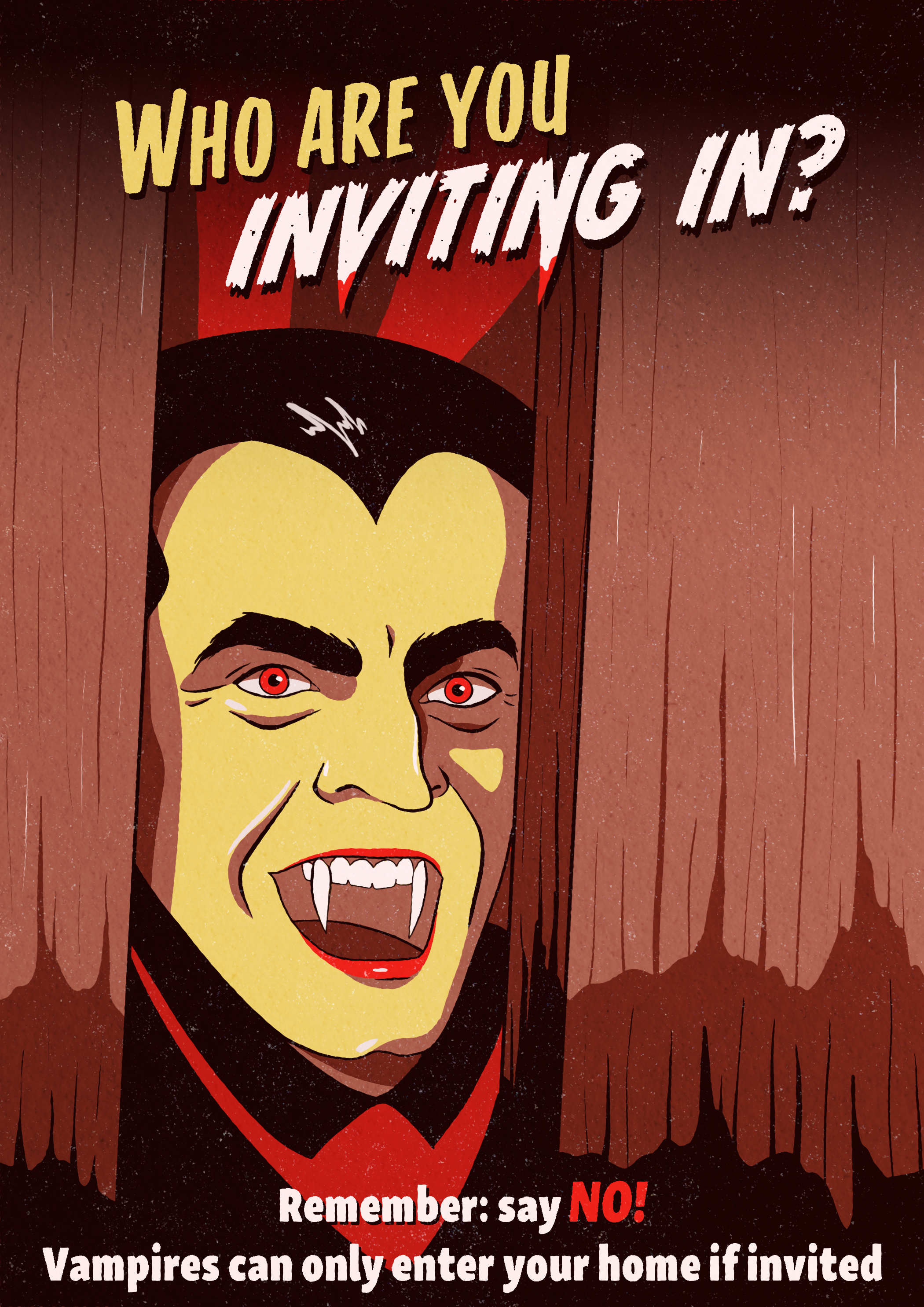 Each design draws on a different historical visual style. The siren poster is inspired by 1940s wartime propaganda, the vampire poster echoes the aesthetic of posters from the 20th-century Second Red Scare, and the zombie leaflet is a direct parody of the “Protect and Survive” booklet distributed to British households during the Cold War in the 1970s. All illustrations are my own.