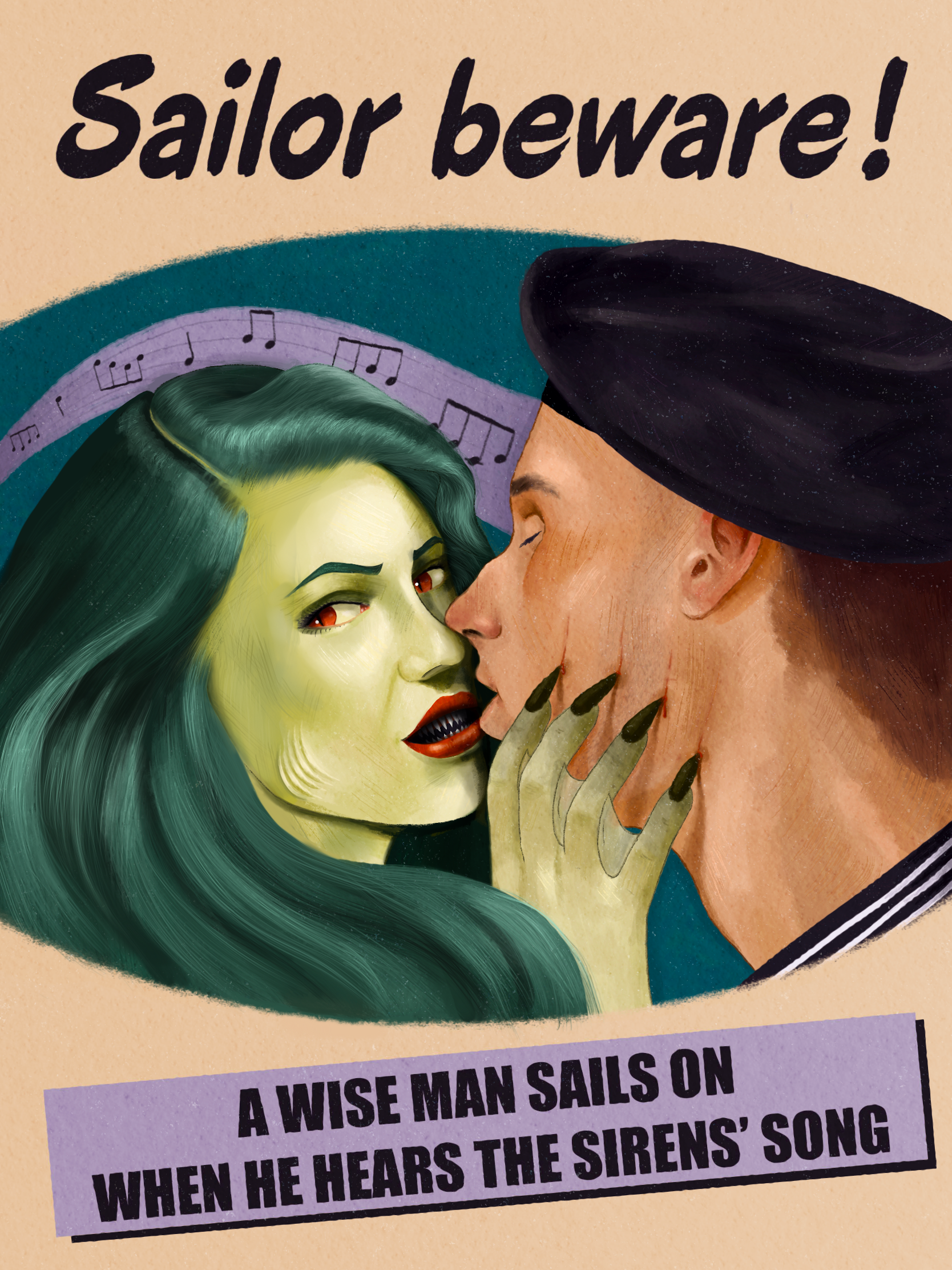 In every piece, I incorporated elements of the creature’s traditional lore. For example, the siren poster references the deadly allure of a siren’s song to sailors, while the vampire poster hints at the folklore rule that vampires must be invited into a home.